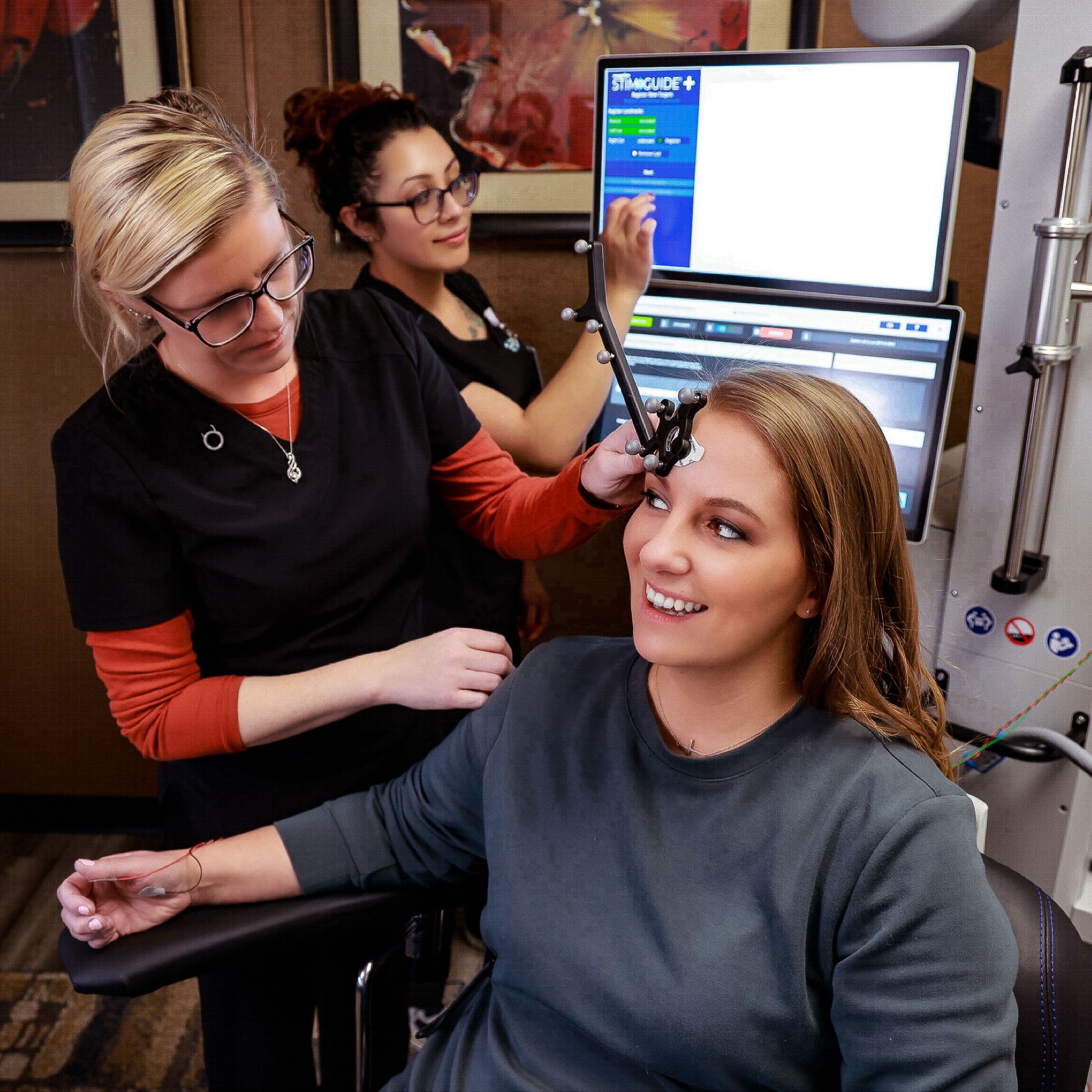The magnetic coil which delivers TMS is positioned on the head. You will hear a clicking sound and feel a tapping sensation on your head when the magnetic pulses are delivered.